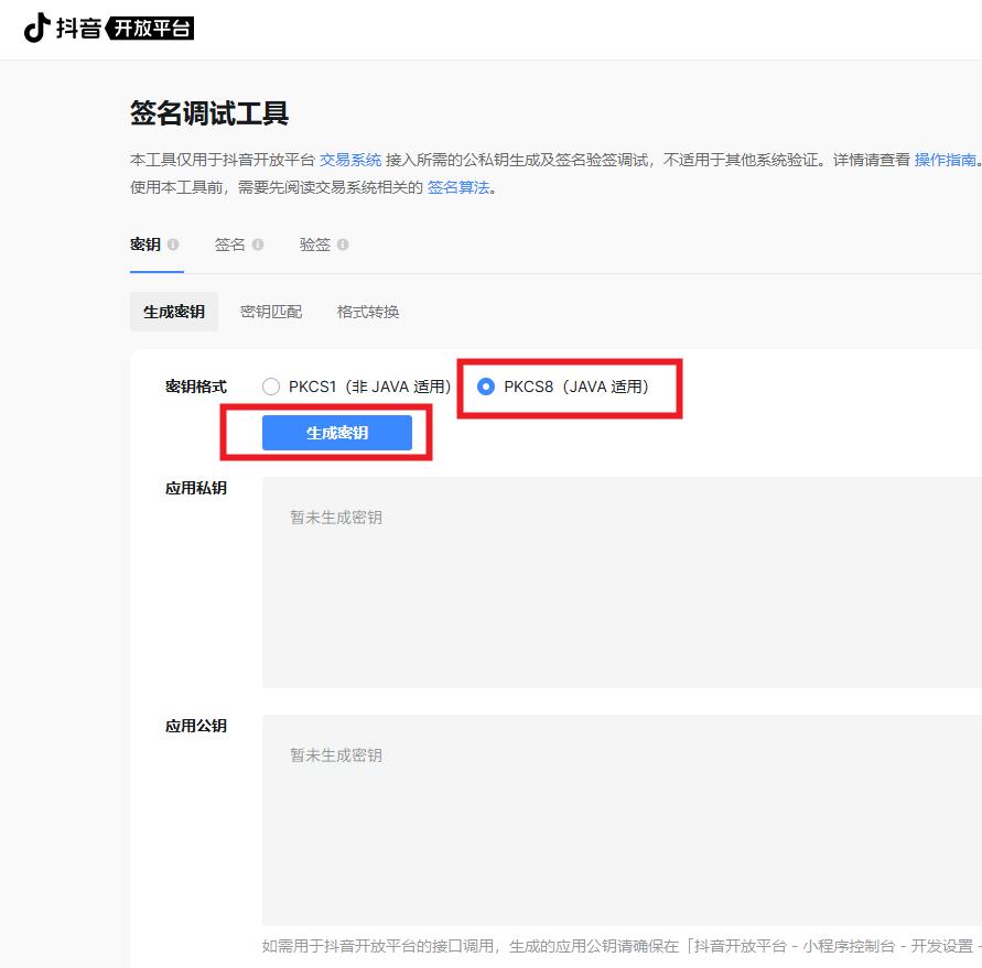 官方生成地址: https://developer.open-douyin.com/docs/openapi-explorer/sign ,选择PKCS8(JAVA适用),如下图